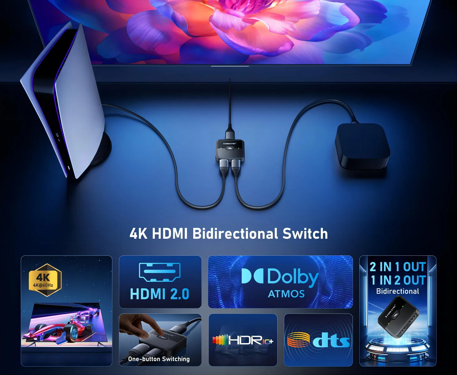 With no need to install additional drivers or complex setups, the HDMI 2.0 bidirectional switcher is designed to be plug-and-play and highly compatible, and can be used in a wide range of devices such as computers, game consoles, Blu-ray players, projectors, monitors, etc., simplifying the operation process for users.