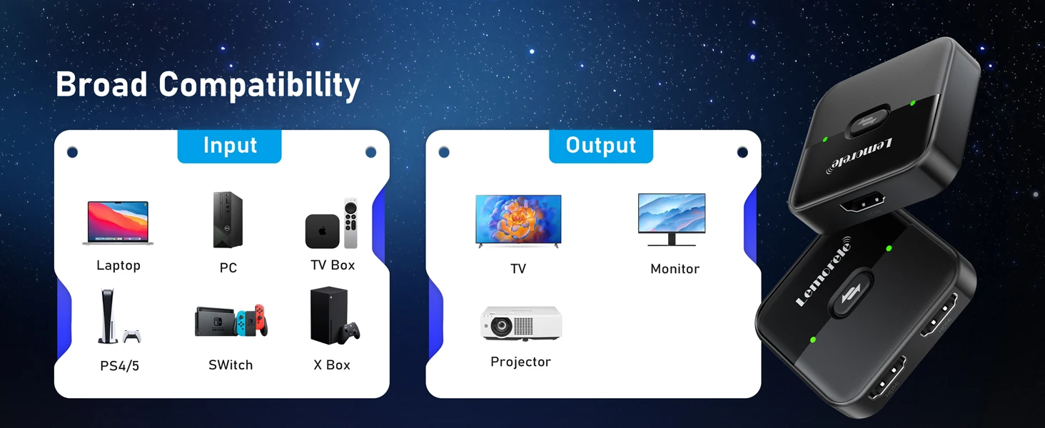 Input: Compatible with Nintendo Switch, PS5/PS4/PS3, Computer, Blu-ray DVD player, Roku, Chromecast, FireStick, Laptop, Xbox, Output: Compatible with HD-Ready or Full HD TVs, monitors, projectors, and more